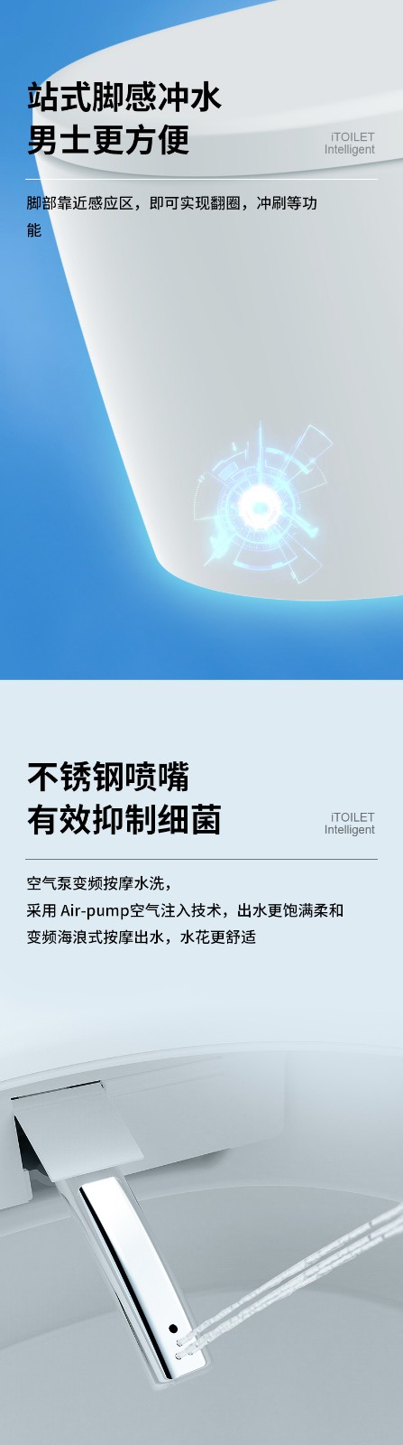 3、主要功能:AI語音控制(可選)、著座感應(yīng)、腳感翻蓋/翻圈/沖刷(可選)、停電(接USB)沖刷、暖風(fēng)烘干、無線遙控、凈味除臭、